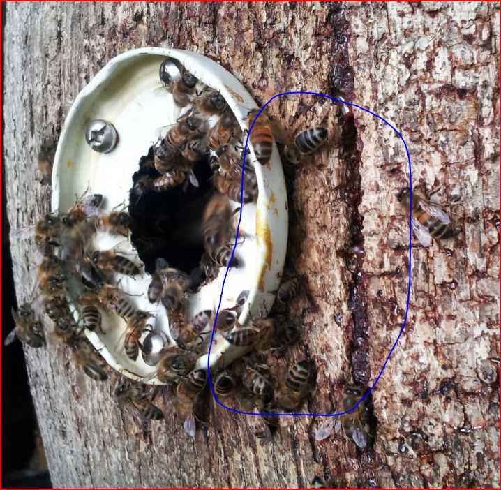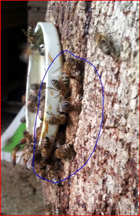 Les abeilles se sont débrouillées pour se faire un accès au travers du bois. Elles ont ensuite grignoté le polystyrène et puis l'ont enduit de propolis. Ce comportement là est certes plus plausible !!!