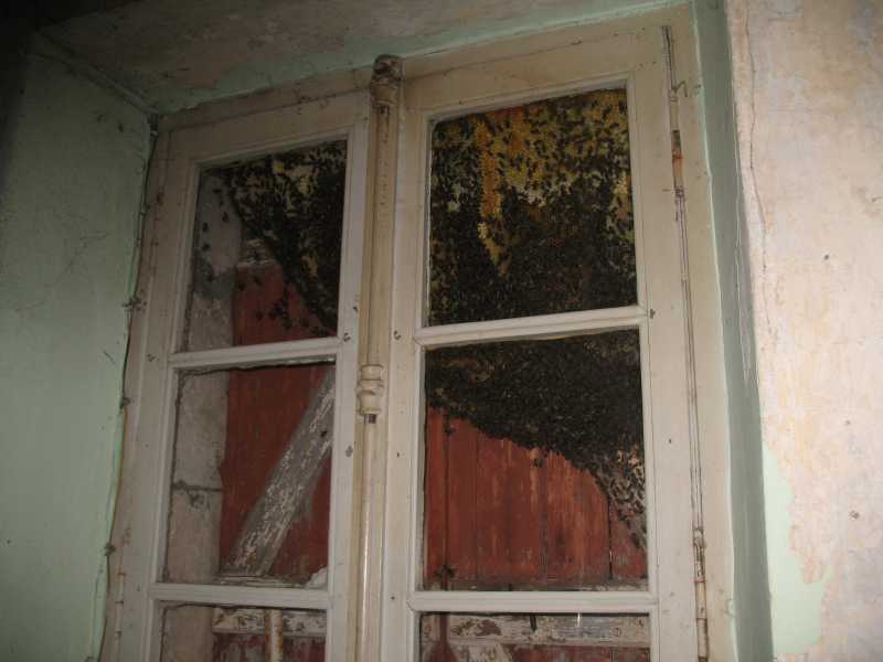 On m'a contacté hier pour un essaim installé depuis quelques temps déjà, entre une fenêtre et un volet fermé, dans une vieille maison inoccupée.