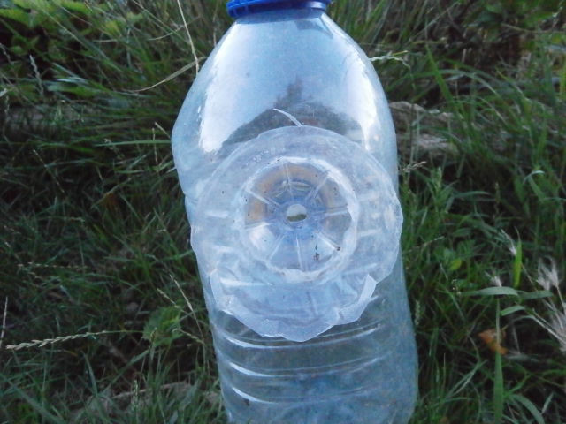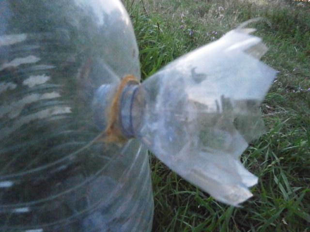 Bon pour la bouteille de 5 litres : Faire en partie haute, un entonnoir avec une petite bouteille de récup en plastique (ici Evian), le coller en haut en le faisant rentrer comme sur la photo. Puis, à l'intérieur de l'entonnoir, coller et percer le cul de la petite bouteille Evian d'un diamètre de la grosseur d'un frelon... Et ça marche ... :evil: