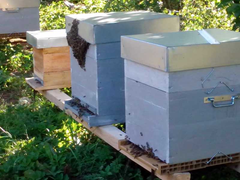 La ruche "porteuse" et une caisse qui est resté en montagne sur laquel j'ai extrait une hausse en juin et qui avait remplie 1/4 de hausse au 18/07... je suis surpris qu'elle essaime et en plus de cette façon!!