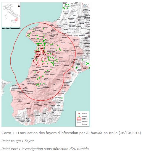 Au 16 octobre 2014, le petit coléoptère de la ruche a été détecté dans 40 foyers situés dans 13 municipalités au total en Calabre (au Sud de l'Italie). Un nouveau cas de rucher avec des larves d'A. tumida a été rapporté portant à quatre le nombre de ruchers où des adultes et des larves ont été détectés ensemble. La répartition des ruchers infestés dernièrement rapportés s'étend vers le Sud de la Calabre. La localisation exacte des 40 foyers et la date de leur confirmation sont disponibles sur ce lien.