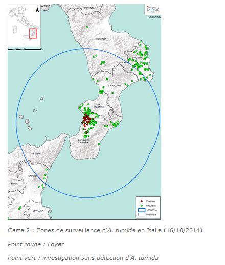 Les zones de protection (20 km) et de surveillance (100 km) autour des foyers sont indiquées dans les cartes 1 et 2 (mises à jour par les autorités italiennes le 16 octobre 2014).