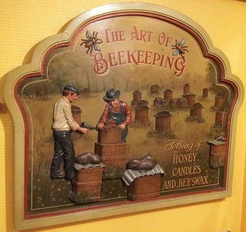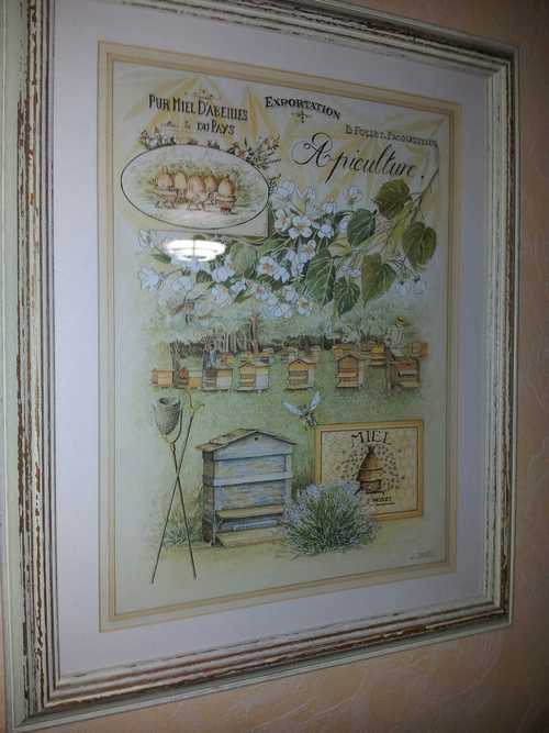 Etant donné la décrépitude de l'apiculture française, (pour ceux qui continuaient à mater les nanas pendant les cours de français, la décrépitude vient après la vieillesse, c'est à dire quasiment à l'article de la mort!), et comme je me dois de ne pas faire de publicité mensongère, il faut donc s'adapter à la situation, et accepter de "repiquer" ce tableau, c'est à dire remplacer le texte en bas à droite par:"Selling of queens and swarms", c'est à dire Vente de reines et d'essaims, puisque nos abeilles butineuses survivantes ne donnent quasiment plus de miel, idem pour les cireuses. Je vais donc me mettre en quête d'un artiste, surement étudiant aux beaux-arts, pour faire cette "mise à jour". Mais étant donné le TOD, le taux de descente de l'apiculture, nous tarderons pas à percuter le sol, je prévois donc de faire cette "mise à jour" de façon temporaire sur un support pelable, de façon à faire apparaître l'inscription ultime, c'est à dire "in memory of", en mémoire de.