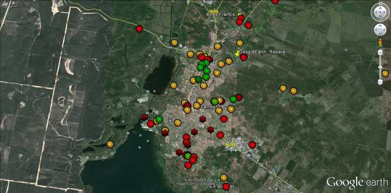 Pour le Var, je ne sais pas. C'est vrai que parfois on retrouve des colonies proches les unes des autres. Mais le postulat de base JS c'est que la territorialité (espace entre les colonies) serait la règle et la proximité l'exception. J'ai pointé sur la carte les colonies que j'ai détruite, sur les trois dernières années. 2012/2013 En 2014 (vert) j'ai jeté l'éponge.