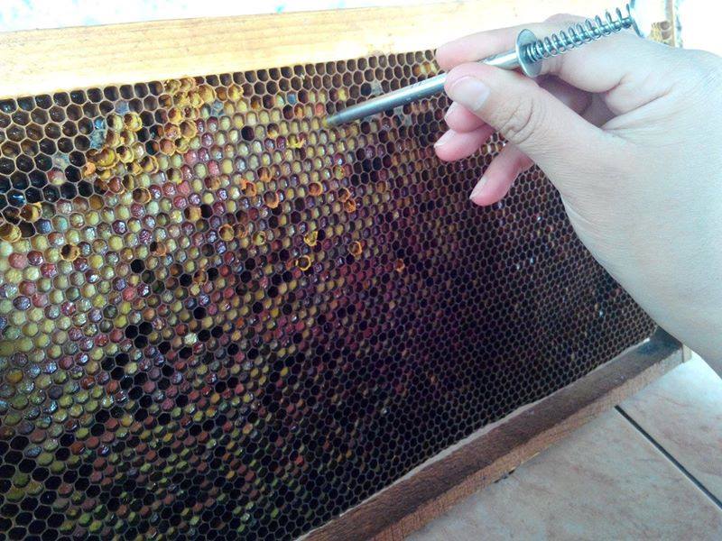 Le cadre est mis dans un congélateur et les brèches congelées sont ensuite cassées ce qui sépare la cire, du pain de pollen.