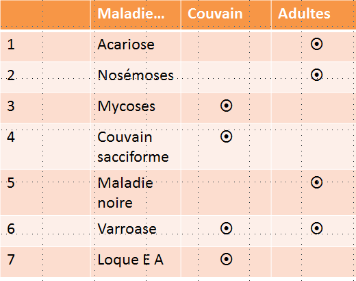 Les maladies du couvain ne sont pas nombreuses et faciles à diagnostiquer, ce tableau pour faire un premier tri et avancer :