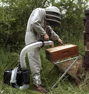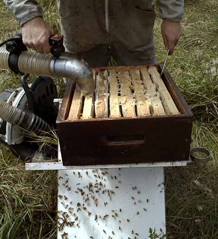 La bache est soufflée gentiment de temps en temps, ce qui accélère le départ des abeilles et leur retour à la ruche.