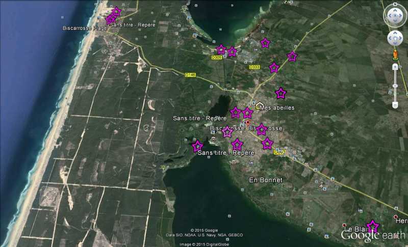 La zone urbaine et péri-urbaine est bien servie, mes abeilles au centre aussi. Vous remarquerez que dans une agglomération, la notion de territorialité est moins marquée vu la quantité de nourriture disponible. Pas la peine de chercher abeilles et guêpes de toiture, il n'y en a plus.