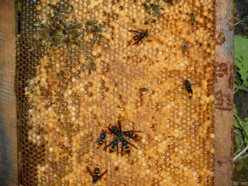 J'ai démonté 1 ruche bourdonneuse et mis les cadres à piller à 100 m du rucher. En 3 quarts d'heure j'ai tué 152 frelons en les coupant au couteau ou à a raquette. Jusqu' à 10 en même temps sur le cadre. Beaucoup repartaient avec des abeilles