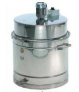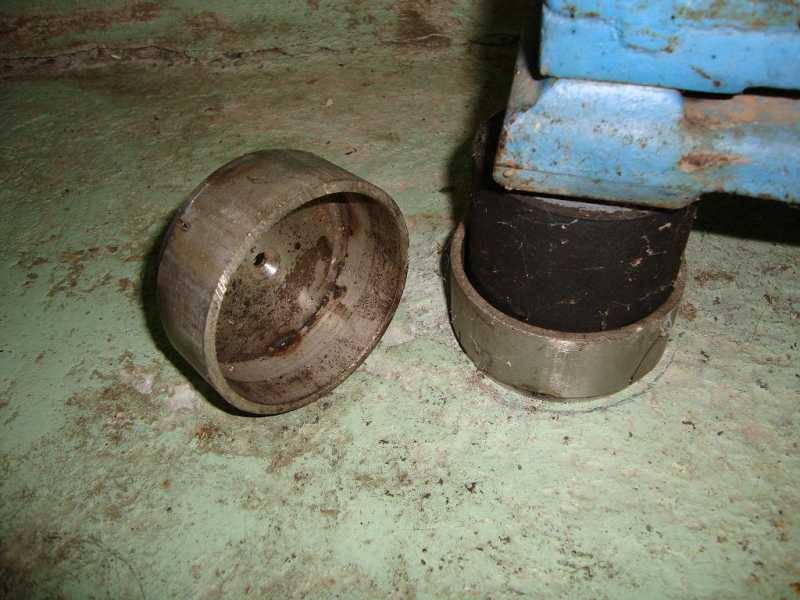 Sur la gauche, les détails de la "pièce" sont visibles, c'est un tronçon de tube, avec un fond plat soudé, et un trou fraisé pour être scellé au sol par une vis/cheville. Le gros tampon en caoutchouc est juste posé à l'intérieur, c'est un montage "flottant", (C'est en 1931 que Citroën avait sorti sa première voiture à moteur flottant, sur silent-blocs!) 80 ans après, n'allez pas fixer solidairement au sol un système sujet à des vibrations. La hauteur des tampons m'a également permis de pouvoir passer un seau avec tamis sous la sortie de la centri.