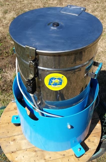 celle avec le tambour qui s ouvre sur l avant, fixé dans un bidon de miel coupé en deux le couvercle du bidon articulé avec une grosse charniere pour sécurisé le coupe tete!!!