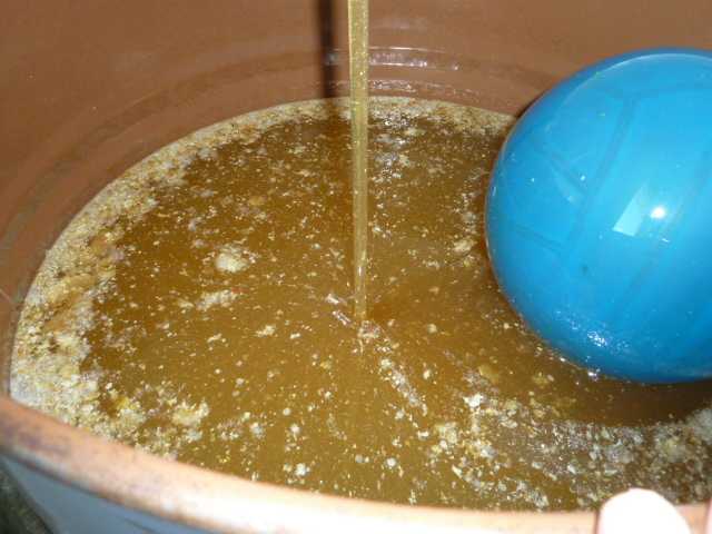 Oui le bac reçoit miel et cire, la pompe expédie l'ensemble dans le spino qui fait la séparation, normalement il reste peu ou pas de miel après l'essorage de fin de journée. De temps en temps, il faut brasser le tout dans le bac pour homogéneifier et permettre la facilitation du transfert par la pompe.