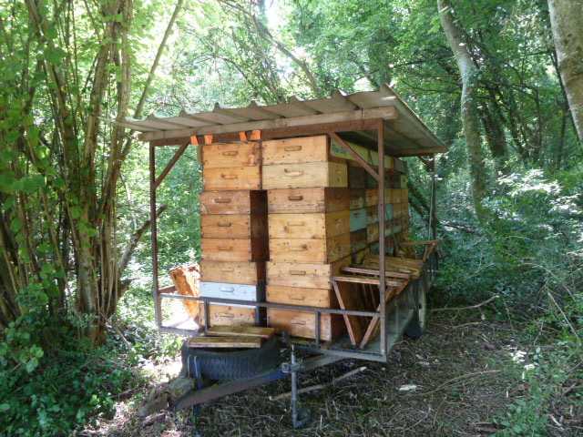 Les hausses sont à 20 mètres des ruches par colonne de 8 ou 10.