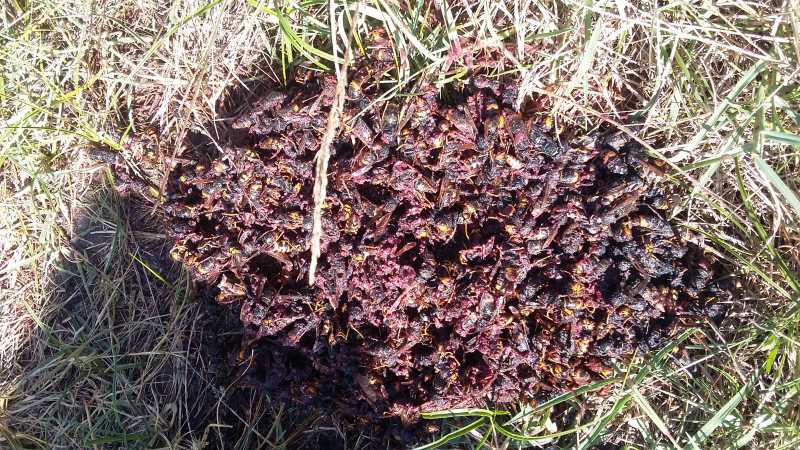 - je rentre d'une visite d'un petit rucher de nuc et ruchettes. Il y encore quelques jours, presque pas de frelons. Donc un peu de répit......je croyais...., en attendant de les déplacer comme les autres. Ben non....! me suis fait liquider les 3/4 des nucs en peu de temps. Tout ce travail fourni pour nourrir et engraisser ces saletés. Et toutes ces reines et essaims qui vont me manquer l'année prochaine....... :sick: