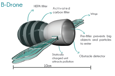 Ces drones-abeilles mesurent 10 cm, et sont assez grands pour embarquer un filtre à (grosses) particules, un filtre à charbon actif et un filtre à particules fines. Lorsque leurs capteurs indiquent une pollution de l’air trop importante, les drones se mettent en marche et s’envolent dans l’espace urbain, puis, lorsque le travail est terminé, retournent à leur base, une sorte de ruche, pour y être rechargées en énergie et nettoyées.