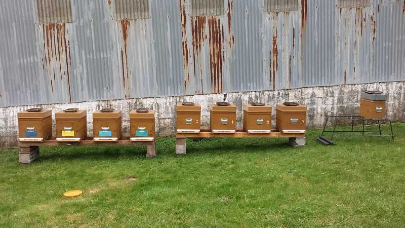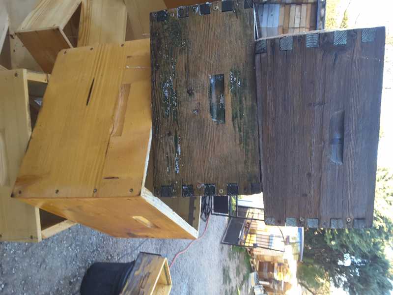 Les quatre ruches de droite sont fabriquées depuis deux ans en sapin du nord et a l’époque, j’émettais quelque doutes quant à leur résistance au climat nordique, elles ont reçues deux couches de peinture après fabrication et une couche à l'automne dernier. Elles n'ont absolument pas bougées.