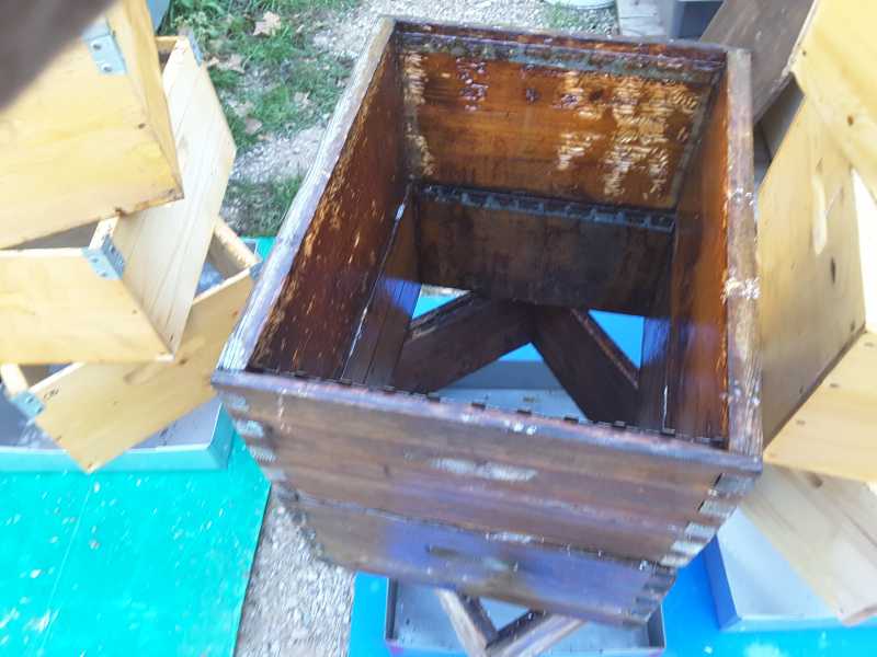 J'ai passé 2 couches d'huile de lin à froid (et donc pas terrible comme tenue dans le temps). Pour donner de la couleur à mes ruches j'ai fabriqué de la peinture suédoise (farine et pigments naturels). Après avoir bien poncé pour enlevé un maximum de corps gras (sinon la peinture n'adhère pas) le résultat m'a bien plus. J'espère que ça tiendra bien.