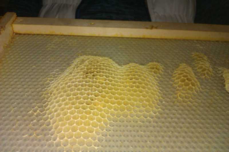 sur ces photos, le problème est que ce cadre a été placé trop récemment dans une ruche..et que nous sommes en novembre. mais malgré cela, sans avoir enduit de cire...on a un début de construction.