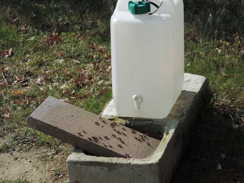Galiacy_S écrit: Pour le moment, j'ai un bidon de 40l avec une sortie en goutte à goutte. Dedans je met du sel (une cuillère à café/5l) et une pastille de javel à chaque passage au rucher (les abeilles aiment bien le chlore et çà empêche qu'un tas de truc pousse dedans). Le tout tombe dans un ancien abreuvoir à cochon dans lequel j'ai mis un parpaing tête bêche pour pas qu'elles se noient (j'avais mis des bouts de bois, polystyrene ou autres, mais le vent d'autan à tout virer). Elles y vont en quantité pour le moment depuis bientôt un an.
