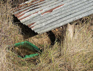 Un 1/2 fût de 200 l coupé dans le sens de la hauteur, enterré. Un tôle ondulée de 1.20 m posée en pente (déversant dans le réservoir) sur 4 supports à 30 à 50 cm du sol. Quelques pierres et des branchages dans le réservoir. Les faisans et autres y trouvent leur compte, mes abeilles aussi. Il y a de l'eau toute l'année (c'est nous, cela correspond à environ 700 litres d'eau récupérée !