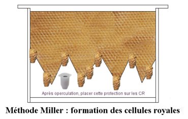 - Le "cadre Miller" que tu insères dans ta meilleure colonie doit te permettre d'avoir des oeufs mais aussi des larves (c'est important), il faut donc au moins une semaine. Pourquoi des larves, parce que la colonie éleveuse (elle doit être différente de ta meilleure colonie) une fois orpheline peut préférer ses propres larves aux oeufs du "cadre Miller", surtout si elle est de tempérament agressive.
