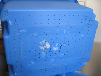 2 bacs en plastiques alimentaires à 2 euros et une bonde. Le bac de dégouttement est percé en fond de trous de 3 mm de diam. Le dégouttement du miel s'opère en une 48 heures à température estivale et découpage des brèches le jour de la récolte (miel bien liquide et encore tiède).