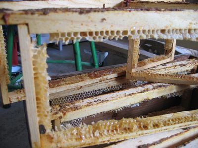 Pour plusieurs apis amateurs avec qqs colonies, j'ai mis au point ce système "d'extraction" par dégouttement très économique (qqs euros). Il est basé sur des amorces (pour la première récolte, ensuite ce n'est plus nécessaire) sur cadres de hausses Dadant.