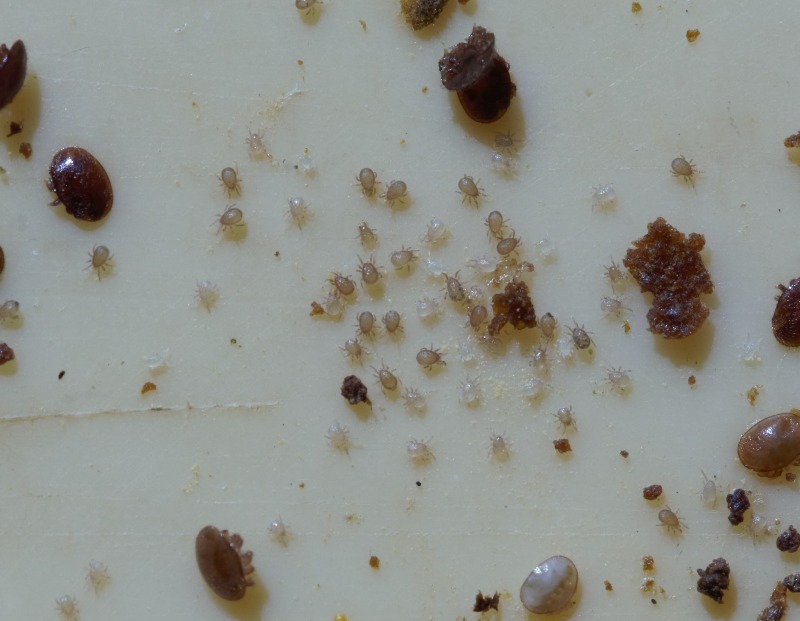 Cet après midi je suis allé faire une petite visite dans mes ruchers contrôler que tout allait bien, j'en ai profité pour relever des plateaux Nicot pour vérifier l'efficacité du traitement a AO de mi décembre ,j'ai inspecté le plateau avec un microscope numérique ,et la je suis tombé sur des bestioles qui cavalaient dans les particules de cire dues a la consommation des provisions ,quelqu'un a t'il une idée de ce que cela peut être ?