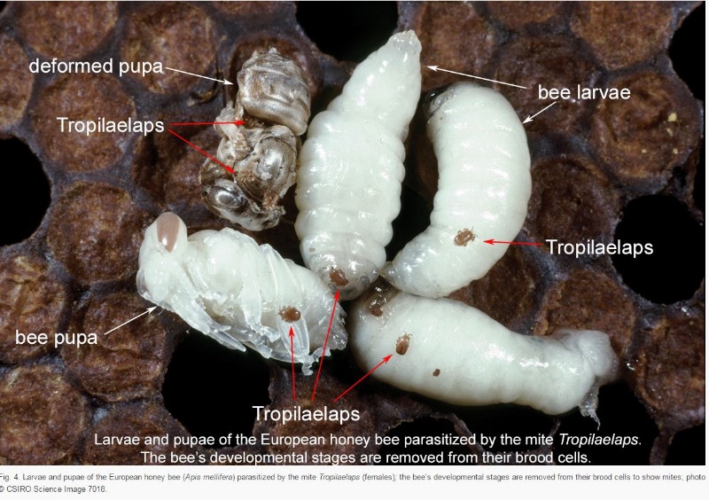 Irb52 nous dit qu'il voit ces"bestioles"  galoper sur les fonds et je me demande si les acariens en général ont cette capacité de se déplacer rapidement pour donner l'impression qu'ils galopent? Sur la photo on les imagine bien debout sur leurs pattes comme des araignées. Je sais que les juvéniles de tiques qui ont cette forme caractéristique de goutte d'eau se déplacent assez vite. Je ne pense pas que ça en soit et surtout j'espère pas....Si on apprend que les tiques comme varroa utilisent l'abeille comme moyen de dissémination ben "on n'est pas sortis de la berge".