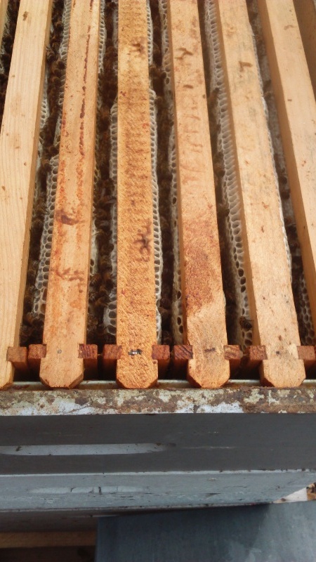 J'ai donc été obligé de dispatcher 5 cadres de miel et pollen aux faibles. Ensuite j'ai enlevé la partition posé 3 cire en bas plus 5 litres de sirop car les provisions était nulle.