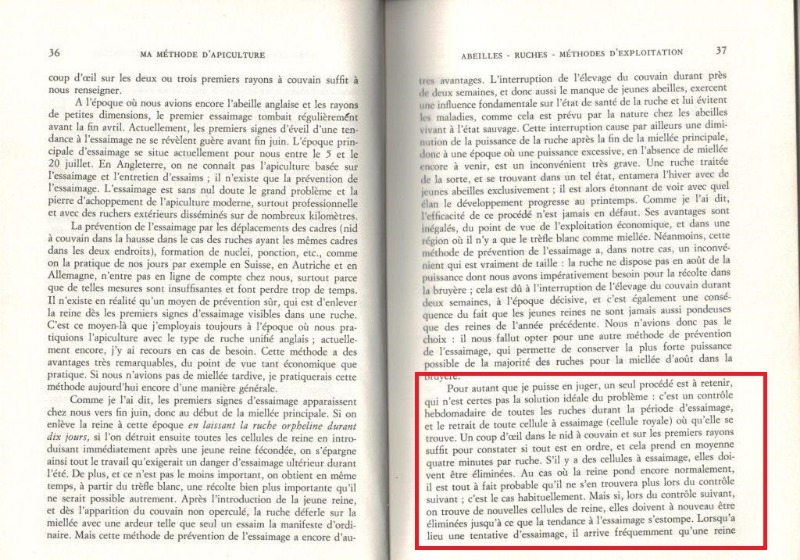 Les flots des idées et des systèmes se sont apaisés, dispersés sur les écueils de la mise en pratique. Il n’existe qu’un seul moyen certain d’empêcher l’éclosion d’essaims, c’est d’enlever la reine aussitôt qu’on remarque les signes précurseurs de l’essaimage. J’avais recours à ce procédé déjà au temps où j’opérais avec les ruchers du type anglais et je continue à l’utiliser aujourd’hui en cas de nécessité. Il présente de multiples avantages pour le rendement commercial de l’exploitation.