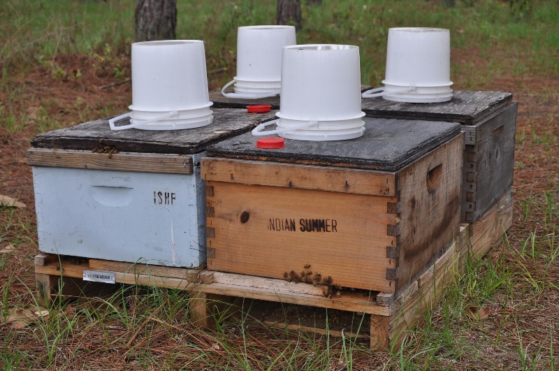 Le nourrissement se fait avec des seaux de 5kg renversés sur le toit, pour les colonies, pour les nucs, sucre en poudre directement dans les "three ways'