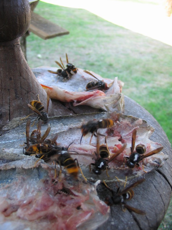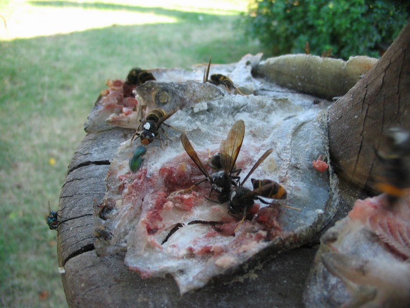 Le frelon s'en va avec sa boulette, je remets du poisson frais épicé.