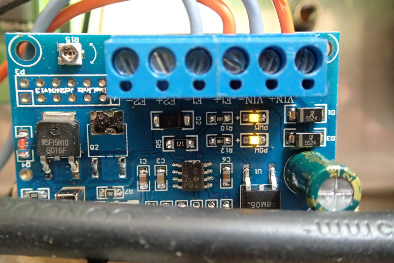 4 - Branchez l’entrée du régulateur sur l’alimentation 24V prise sur le bornier, puis rebrancher le ventilateur sur la sortie de régulateur.