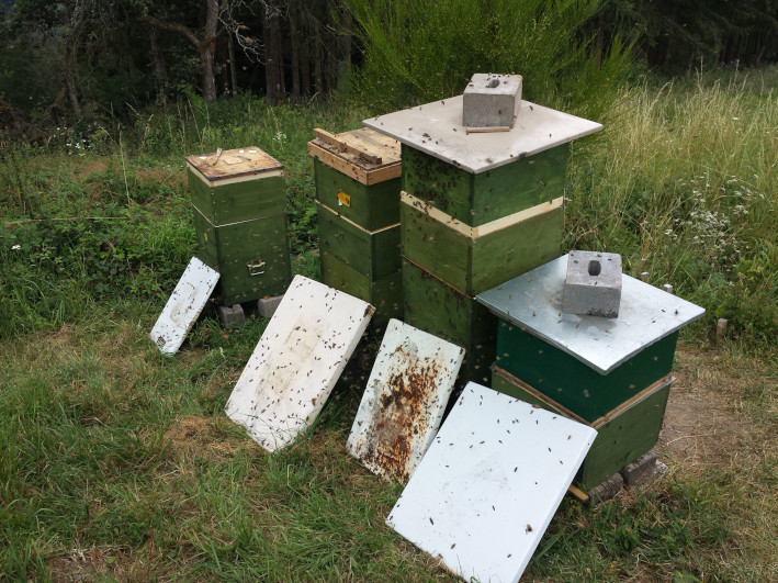 2 jours plus tard j'ai enlevé deux greniers supérieurs à l'emplacement de mes premières 3 ruches et il y avait d'un moment à l'autre à nouveau beaucoup d'abeilles, qui, à mon étonnement, ne s'intéressaient pas aux greniers enlevés.