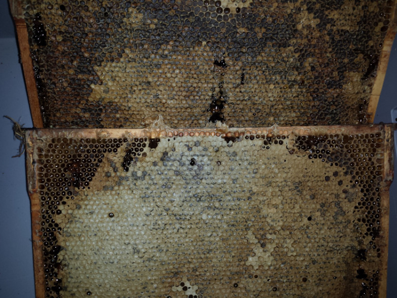 D'ailleurs, parmi les cadres que j'ai retirés il y en a deux dont les opercules (correct?) sont drôlement foncés. A quoi cela peut-il être dû? Qu'ils ont été operculés depuis plus longtemps que les autres? Sur la photo ci-attachée on voit 2 cadres assez foncés (c'est l'exception) dont les opercules du supérieur sont très foncés, ceux de l'autre plus clairs.