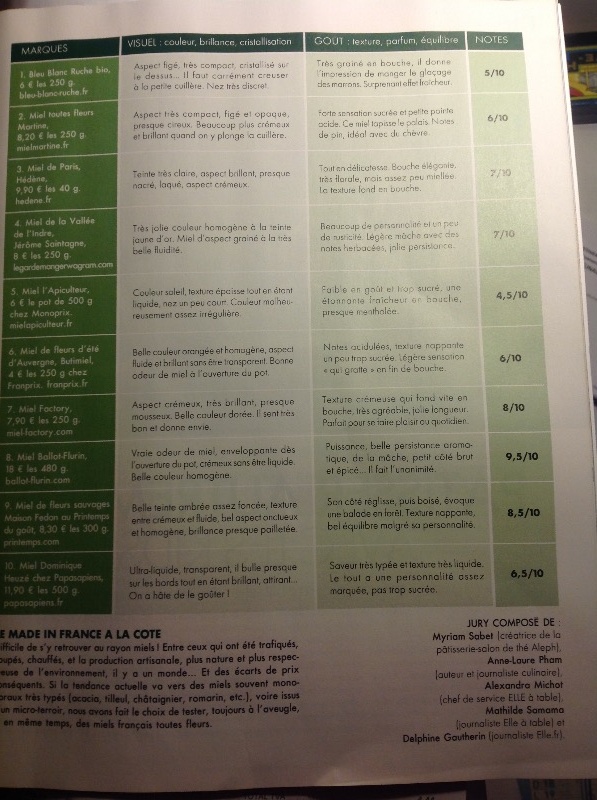 Filez voir dans votre kiosque ELLE À TABLE ce mois-ci (janvier 2019) : 10 miels français toutes fleurs au banc d’essai.