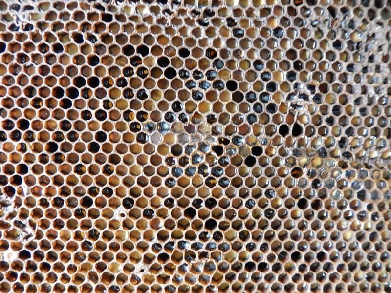 Il y avait quelques pupes mélangées à des alvéoles pleines de miel, mais surtout certaines étaient entièrement bouchées à la cire.