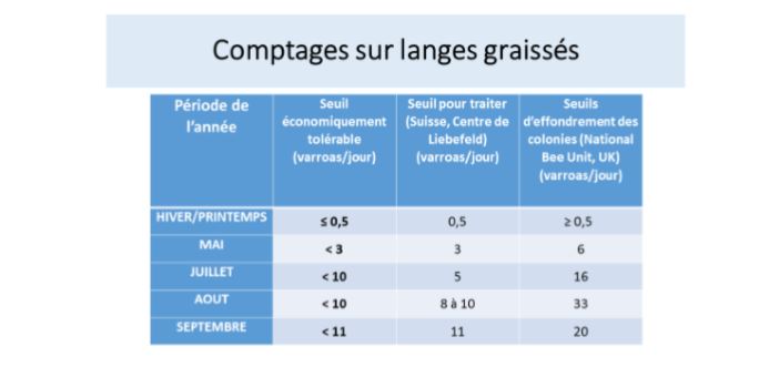 Je viens de faire un comptage de varroas (chutes naturelles de varroas phorétiques sur lange) mais je n'arrive pas à savoir quelle est le seuil à partir duquel il faut traiter ! Je trouve plein d'infos sur internet mais jamais les mêmes !