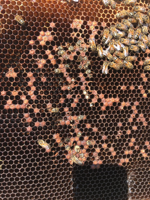 Les alvéoles trouées peuvent êtres dues au varroa, à l'abandon de couvain trop nombreux qu'elles peinent à nettoyer, à la loque...
