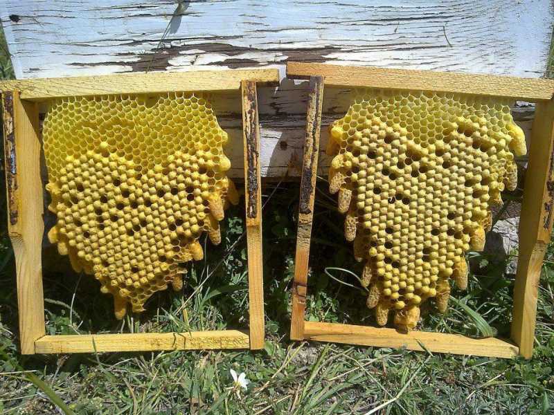 j avais ramassé une colo dans un arbre j avais mis les rayons de couvain en cadres et il y en avait trop alors pour pas les jeter je les avait couchés soutenu par un taquet de cire pour que les zaza puissent passer dessous.