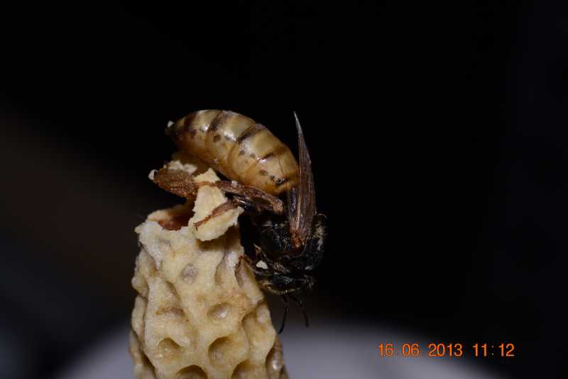 Courant moi de mai lorsque la saison des essaims commencera je vais coller (avec de la cire) des cupules en cire d'abeilles sur le bord du cadre de couvain unique de mes colonies de labo et ensuite resserrer un peu la colonie pour voir si la reine finira par pondre dans les cupules et la colonies élever ainsi des reines d'essaimage....