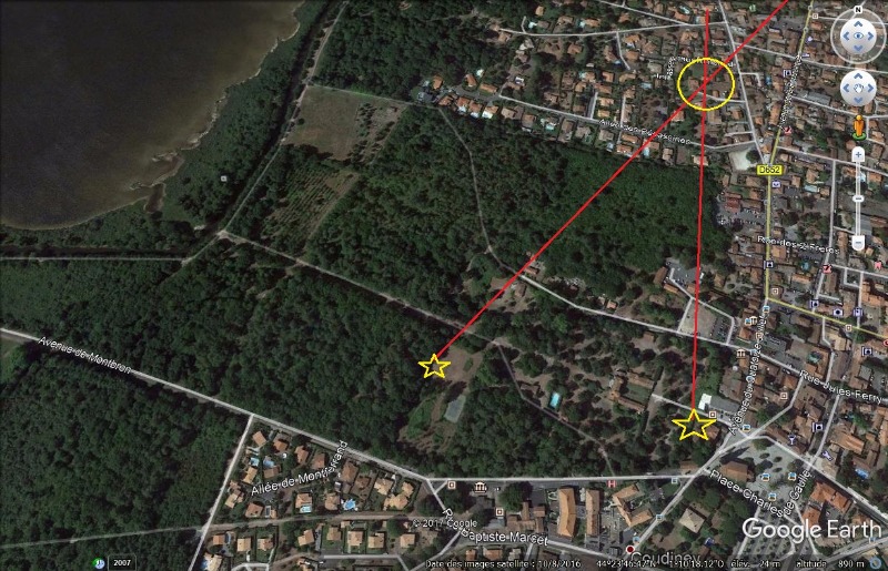 Cette mesure (l'angle) peut utilement être reporté sur une carte et mieux sur Google earth. La ligne donne l'axe approximatif où se trouve la colonie. La distance, on peut s'attendre à devoir aller chercher jusqu'à plus de 1000m.