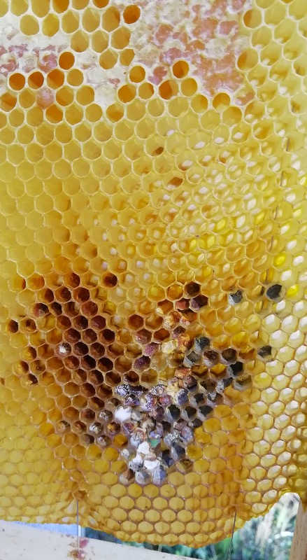 Bien sûr je ne vois que les photo et je n'ai pas tout l'historique de ta ruche mais si j'additionne: ton couvain uniquement operculé qui n'occupe que 1 voir 1,5 cadre avec ma méthode, le fait qu'il y ai des trous dans celui-ci, que se soit une reine verte, ruche pas populeuse, que nous sommes du Var tous les deux, que je ne vois pas de larves, pas de mâles ou de couvain de mâle: je suis quand même septique pour ta ruche.