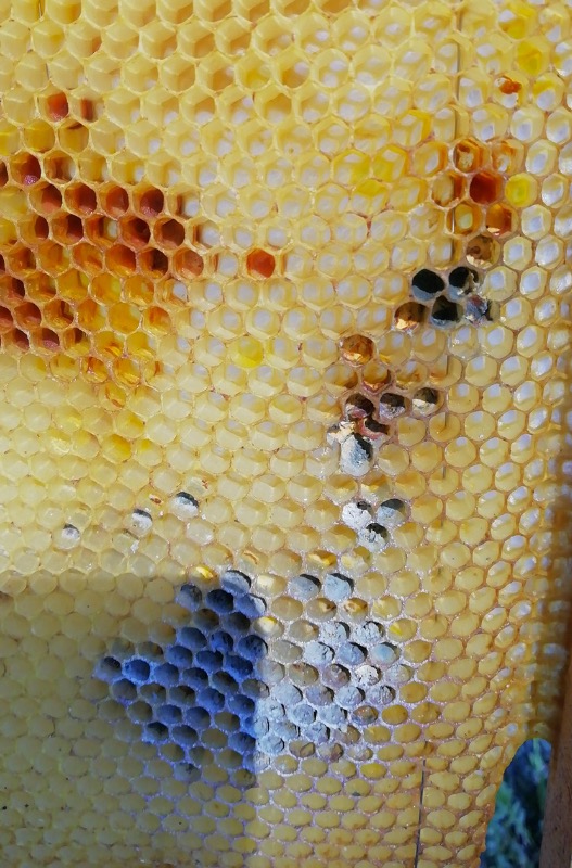 On voit qu'il y a du couvain operculé mais pas en grande quantité (c'est mon avis). Je pense que les photo 2 et 3 sont les recto et verso d'un même cadre. Et le recto n'est pas beau: couvain disséminé: par endroit il y a même trois alvéoles vides entre deux zones de couvain operculé: cela m'intrigue.