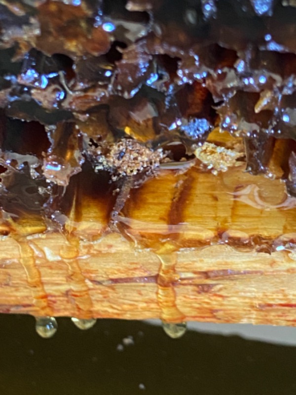 Cependant, ce que je n'aime pas sur ta photo: j'ai l'impression que les opercules de tes alvéoles de miel ont été mangées. Je pense que ta photo est à l'envers de part l'angle des alvéoles et donc que le miel coule du fait de ce renversement?