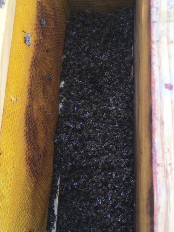 Pour l’autre ruche, s’il n’y a vraiment plus de reine (au fait, est-ce que tu les marques ?) je la secouerai à distance du rucher (environ 20-30m). Les cadres de miel ainsi récupérés feront un passage dans le congélateur avant stockage afin de se débarrasser de la fausse teigne. Ces cadres de miel pourront ainsi te servir ultérieurement.