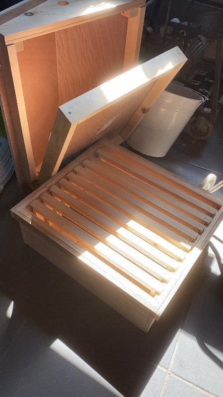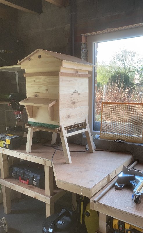 Je possède une ruche dadant 10 cadres, entièrement "réalisée maison" avec des matériaux de récup (zéro déchet oblige) à l'exception du fond, grille à reine et de la quincaillerie habituelle (crémaillère, fixe-éléments,...) -> Deux photos ci-dessous.