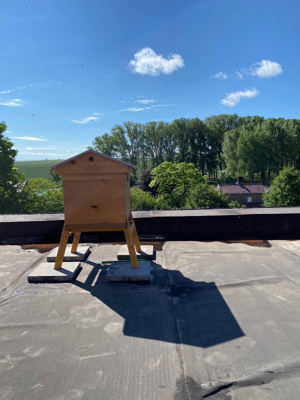 pour info un toit ce n' est pas l'ideal pour mettre des ruches du point de vue du vent de la chaleur en Eté il faut les proteger egalement des courants d'air et du vent palissade entourage etc (surtout en cas de coup de froid du Nord ). La ruche a l' air trés bien construite mais j'' ajouterai un fond fermé ( blanc pour les comptages varroa periodiques egalement) , fixation au sol aussi en cas de tempete comme elle est sur des pieds. Apres sirotage ajout de cires gaufrés et visites periodiques la nature fera le reste dans un premier temps.