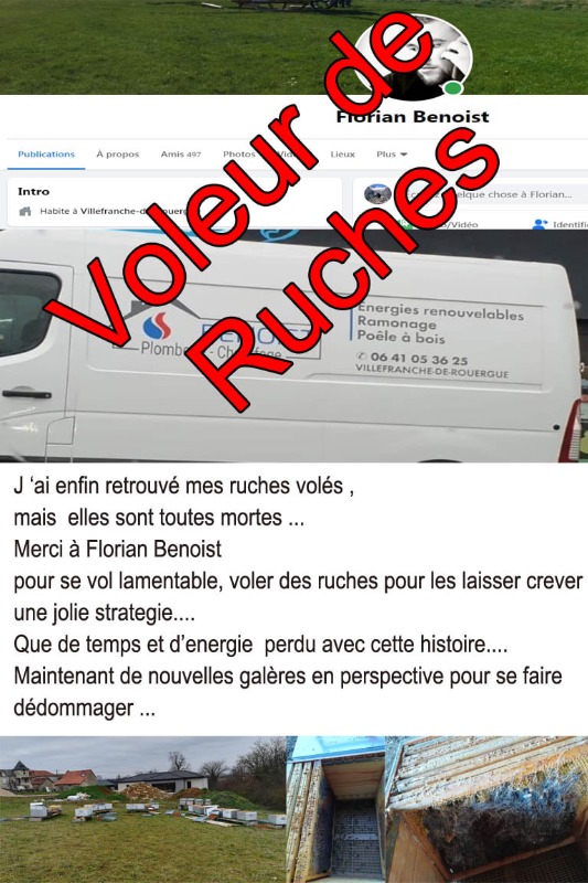 le plus fort est que quand je fait tourner l'identité de mon voleur sur les réseau sociaux l'on me rappelle qu'il est illégal d'accuser quelqu'un de vol ( même si il a reconnu et que les ruches étaient devant sa maison) tant que celui ci n'est pas reconnu coupable par la loi ( qui elle ne le poursuit pas